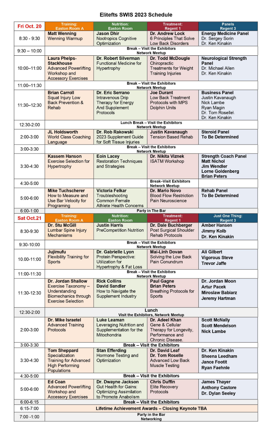 We purposely cover a wide range of relative topics that enable You - the attendee to bring home a wealth of knowledge and skills in the art of getting stronger, faster, healthier and painfree. Experts will gladly share their innovatve techniques and methods which will prove valuable to your business.